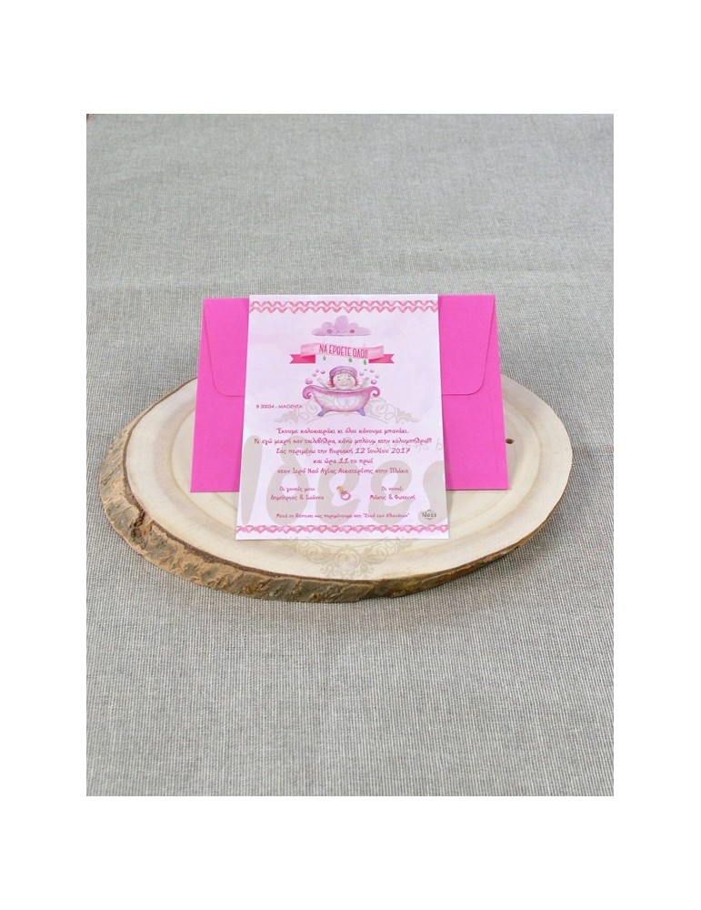 Προσκλητήριο βάπτισης κάρτα σε οπαλίνα λευκή με φούξια φάκελο.