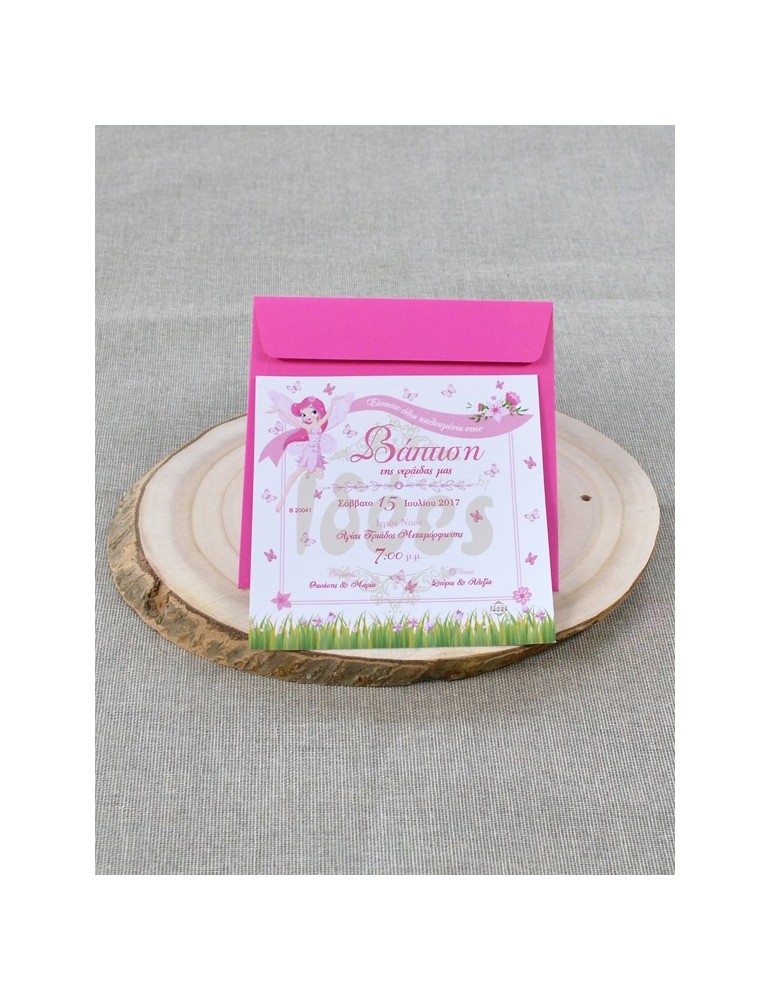 Προσκλητήριο βάπτισης κάρτα σε οπαλίνα λευκή με φούξια φάκελο.