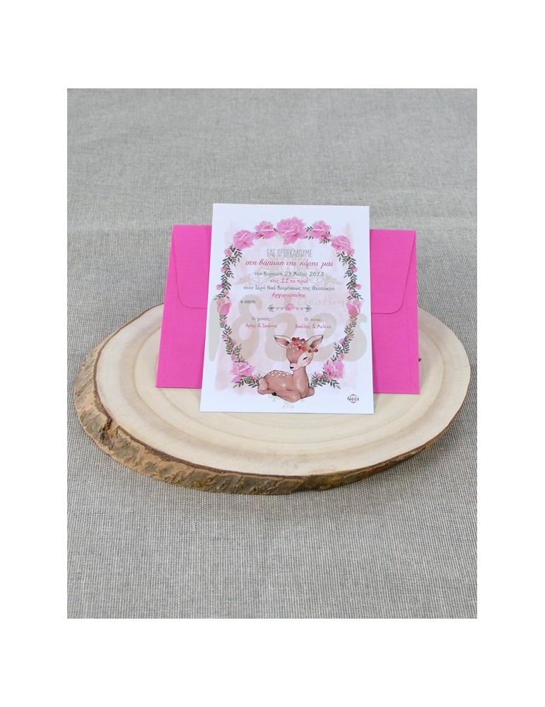 Προσκλητήριο βάπτισης κάρτα σε οπαλίνα λευκή με φούξια φάκελο.