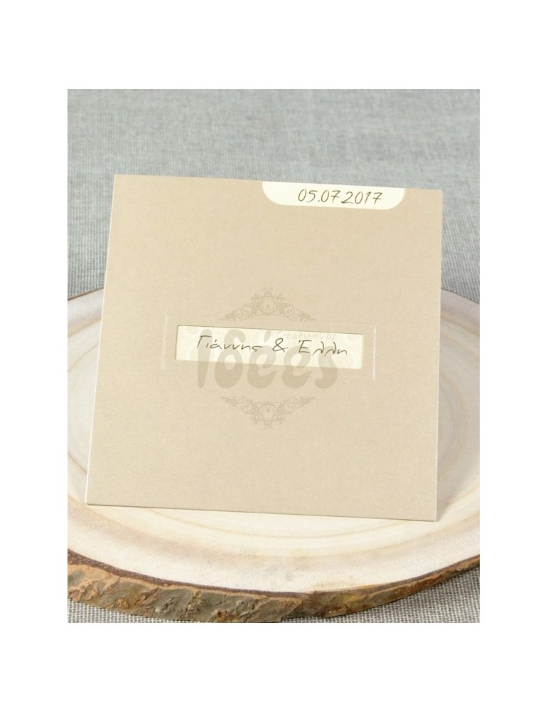 Φάκελος 15,4 Χ 16 εκ. σε sand (άμμου) μεταλλικό χαρτί 250 γρ. με κοπτικό πλαίσιο με γκοφρέ περίγραμμα.