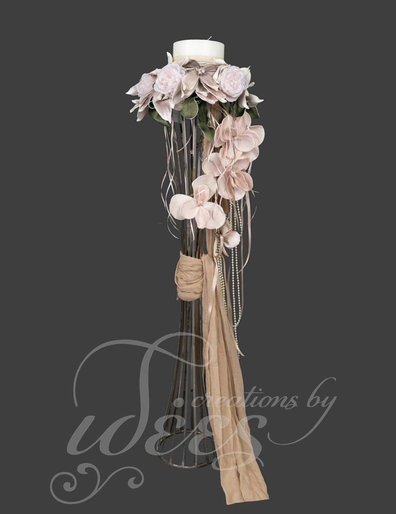 Λαμπάδα μεταλλική σε ασημί απόχρωση διακοσμημένη με τριαντάφυλλα και δαντέλα. Στην τιμή δεν περιλαμβάνετε το κερί.
