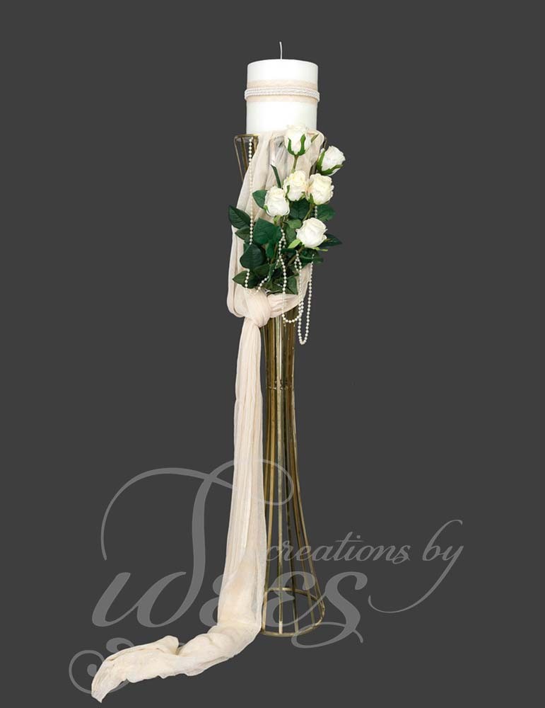 Λαμπάδα μεταλλική σε χρυσή απόχρωση διακοσμημένη με εκρού τριαντάφυλλα και πέρλες.