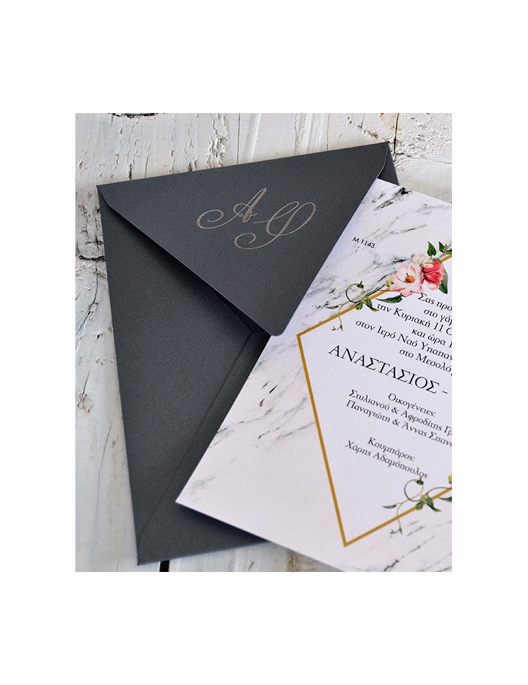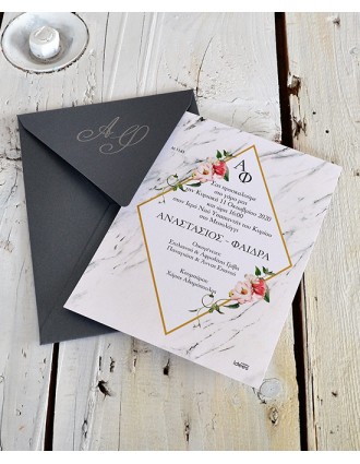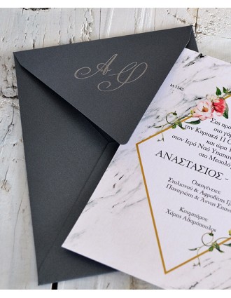 Μοντέρνο προσκλητήριο γάμου. Διαστάσεις: Κάρτα 15 x 15.7 εκ. Φάκελος 15.5 x 16 εκ. Εκτύπωση κάρτας δείγματος: Απλή.