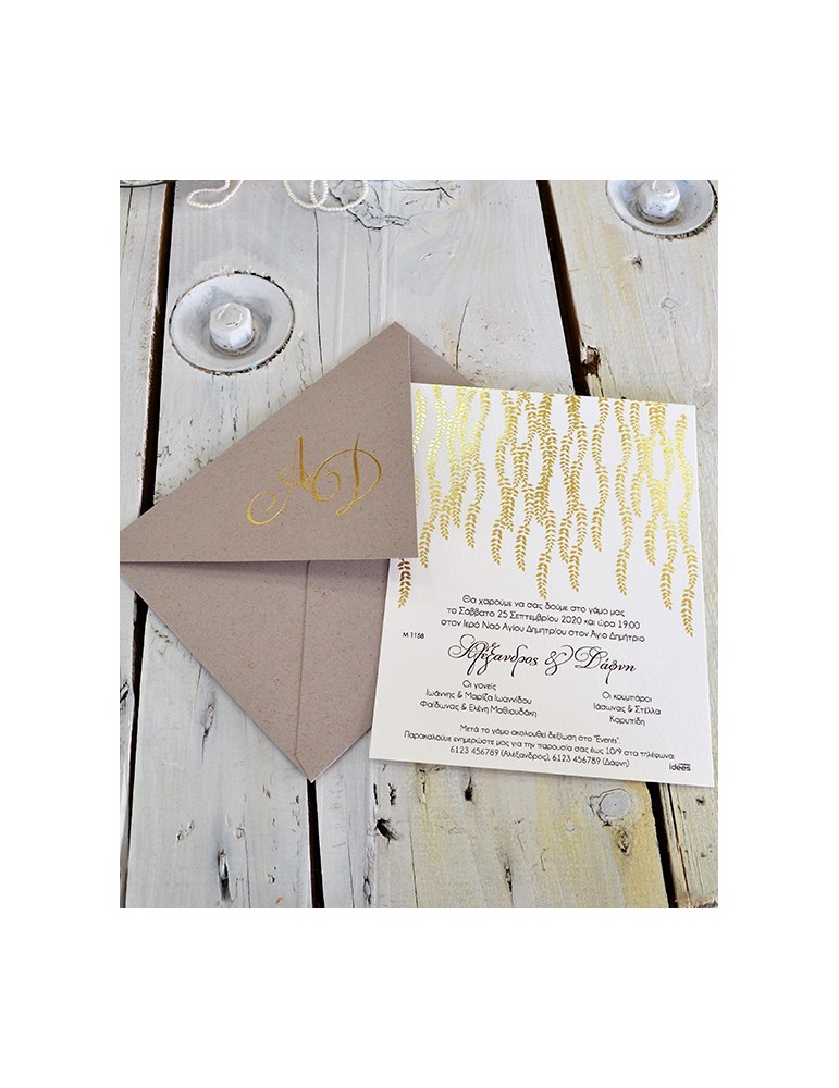 Μοντέρνο προσκλητήριο γάμου. Διαστάσεις: Κάρτα 14 Χ 19 σε Λευκό μεταλιζέ χαρτί στα 250 γρ. Φάκελος 14,5 X 19,5 εκ. σε Λευκό μεταλιζέ χαρτί στα 250 γρ. Εκτύπωση κάρτας δείγματος: Απλή, τετραχρωμία. Εκτύπωση φακέλου δείγματος: Θερμοτυπία χρυσή (Χρυσοτυπία)