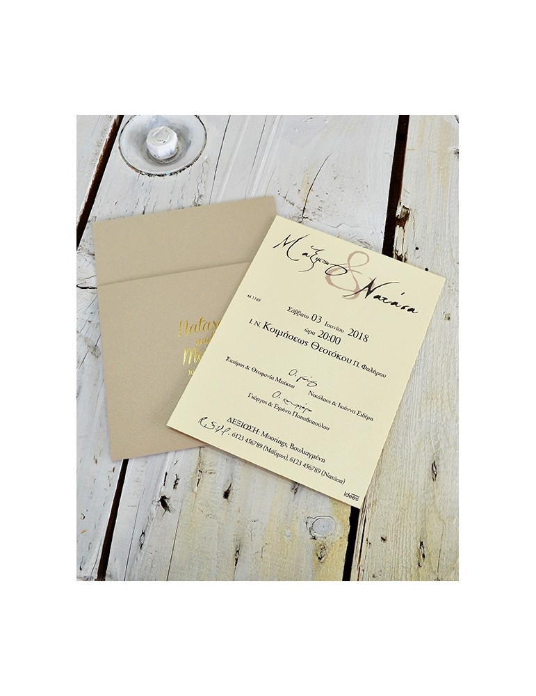 Μοντέρνο προσκλητήριο γάμου. Διαστάσεις: Κάρτα 11,5 Χ 16 εκ. σε Εκρού μεταλιζέ χαρτί στα 250 γρ. Ανάπτυγμα κάρτας 34 Χ 16 εκ. Φάκελος 13 Χ 17,5 εκ. σε Sand χαρτί στα 120 γρ. Εκτύπωση κάρτας δείγματος: Απλή, τετραχρωμία 2ης όψης.