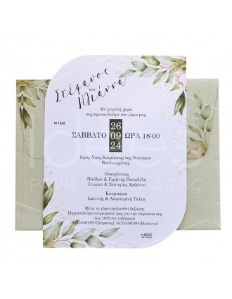 Προσκλητήριο γάμου με φύλλα στις δύο γωνίες και στρογγυλεμένες τις δύο γωνίες.