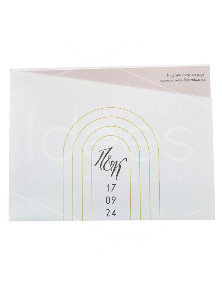 Μοντέρνο προσκλητήριο γάμου. Διαστάσεις: Κάρτα 16,6 Χ 24,6 εκ. σε Milk μεταλιζέ χαρτί στα 250 γρ. Φάκελος συρταρωτός 17 Χ 25 εκ. σε Nude Soft Touch μεταλιζέ χαρτί στα 300 γρ. Εκτύπωση κάρτας δείγματος: Απλή, τετραχρωμία. Εκτύπωση φακέλου δείγματος: Θερμοτυπία ροζ - χρυσό.