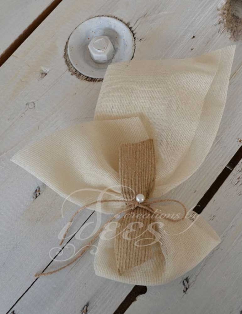 Μπομπονιέρα με εκρού γάζα μαντήλι δεμένη με σπάγγο και διακοσμημένη με κορδέλα τύπου λινάτσα και πέρλα.