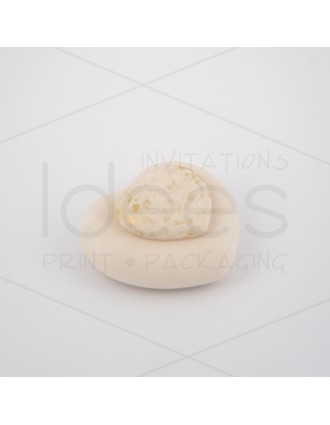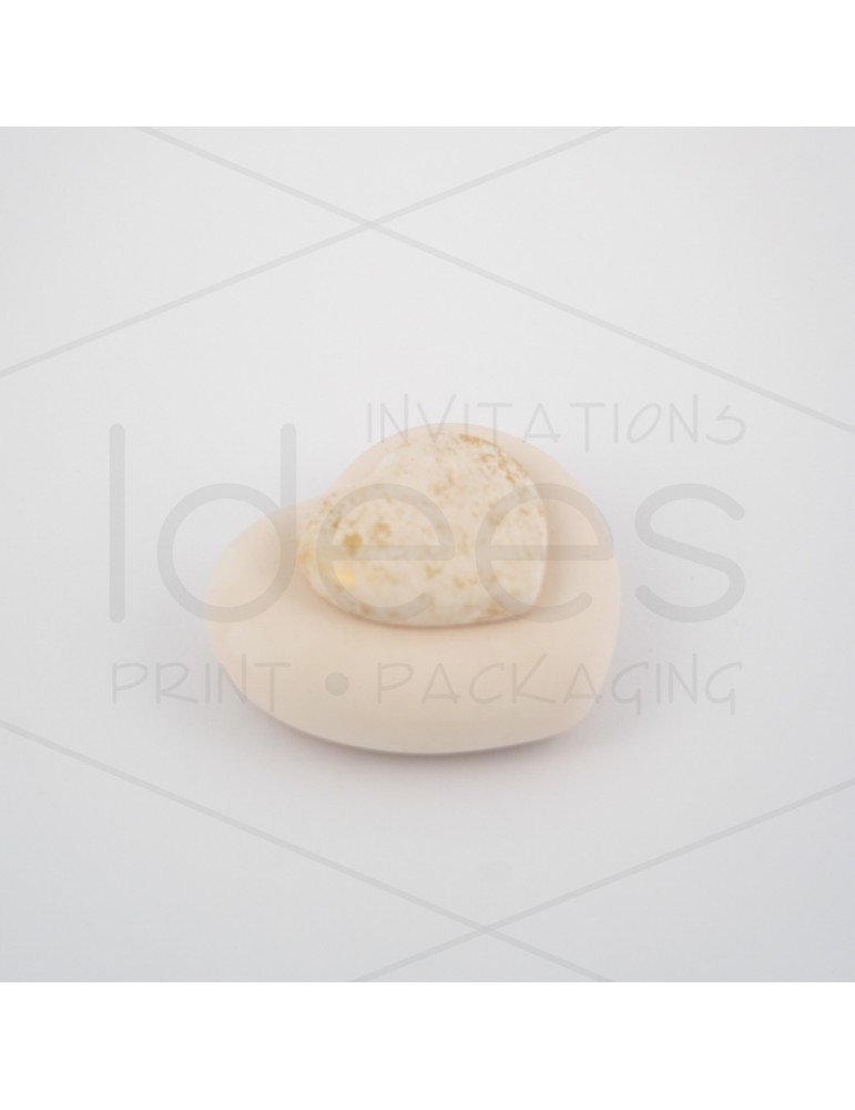 Μπομπονιέρα γάμου πουγκάκι σε off white απόχρωση και δύο κεραμικές αρωματική καρδιές στην γκρο κορδέλα. Διάσταση πουγκιού 8*17 εκ. Στην τιμή περιλαμβάνονται 5 κουφέτα αμύγδαλο.
