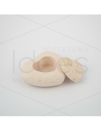 Μπομπονιέρα γάμου κεραμική καρδιά με χρυσές πατίνες στο καπάκι της μπιζουτιέρας.