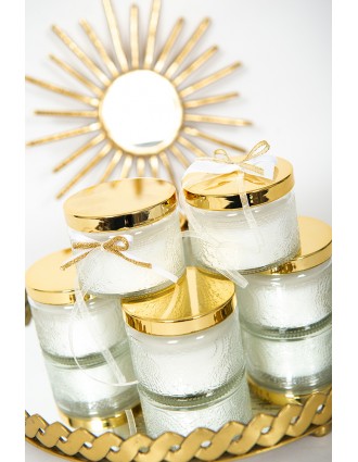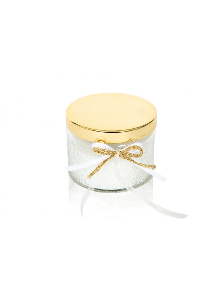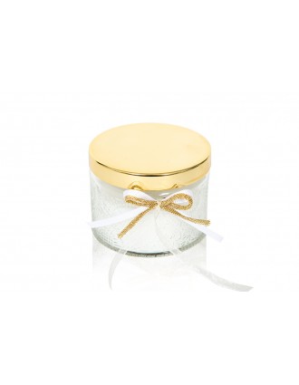 Γυάλινο λευκό βαζάκι με καπάκι, περιέχει κεράκι.