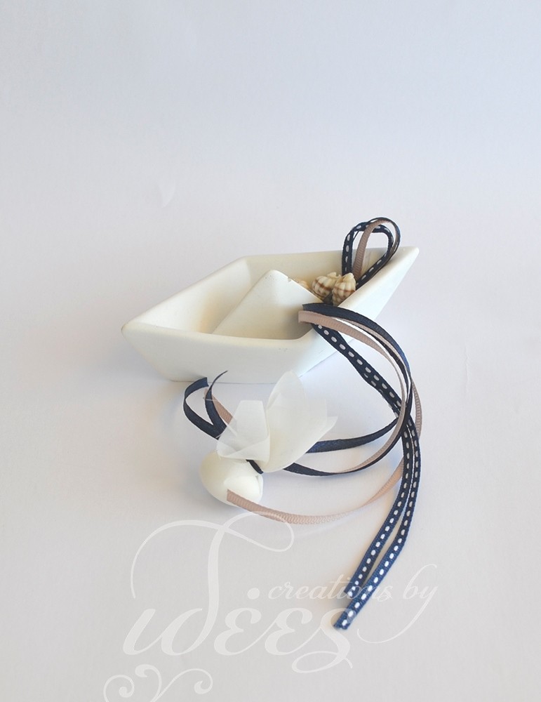 Κεραμικό καραβάκι με μπλε κορδέλες και κοχύλια.
