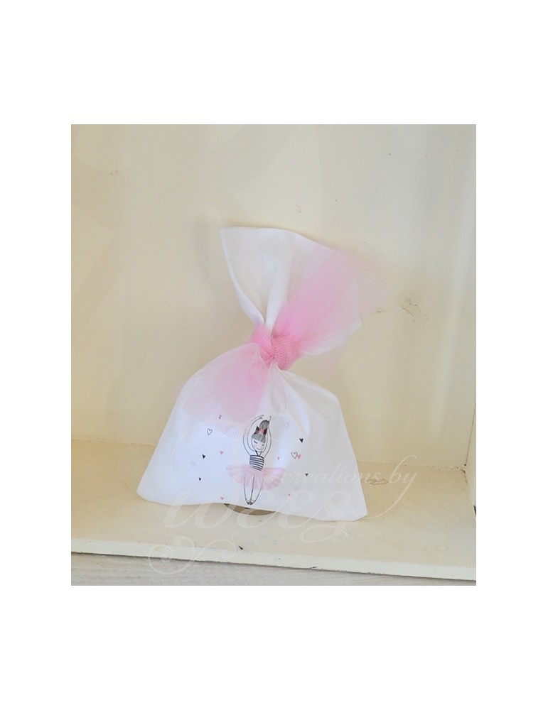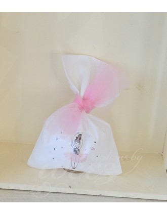 Μπομπονιέρα βάπτισης λευκό βαμβακερό πουγκάκι με θέμα την μπαλαρίνα.