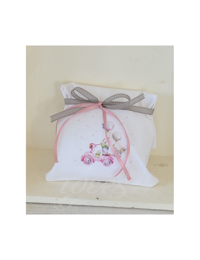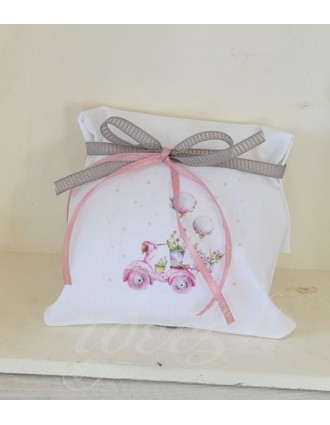 Μπομπονιέρα βάπτισης λευκό βαμβακερό με θέμα την βέσπα.