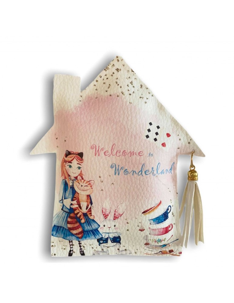 Mπομπονιέρα βάπτισης δερμάτινο σπιτάκι τυπωμένο με θέμα την Αλίκη στη χώρα των θαυμάτων.