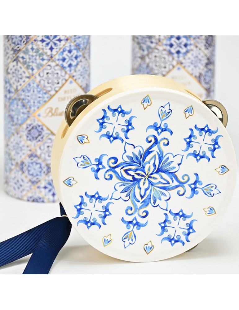 Μπομπονιέρα βάπτισης ξύλινο ντέφι με μπλε μοτίβο.