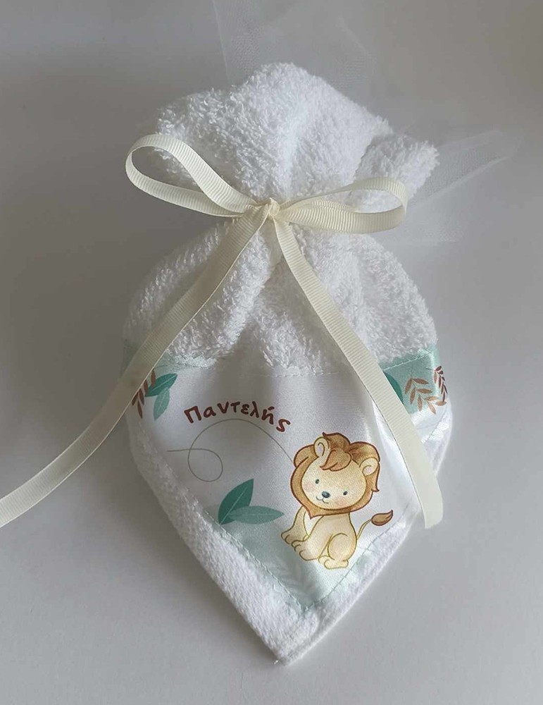 Μπομπονιέρα βάπτισης πετσέτα χεριών με τυπωμένο ύφασμα στην μία γωνία με θέμα λιονταράκι.