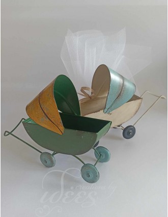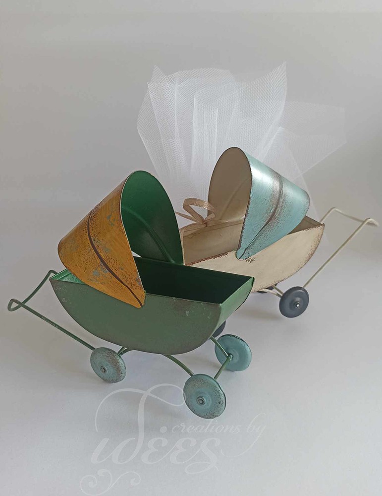 Μπομπονιέρα βάπτισης μεταλλικό vintage καρότσι, σε δύο χρώματα μαζί.