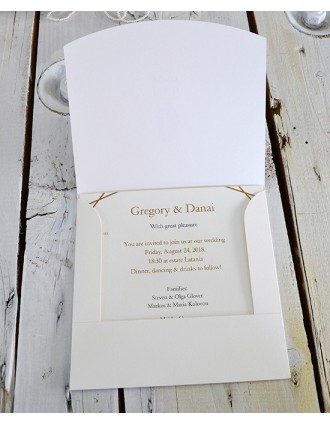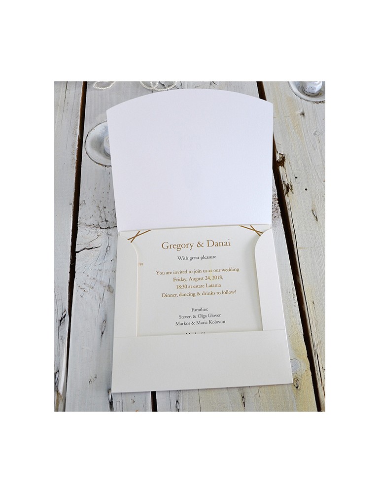 Μοντέρνο προσκλητήριο γάμου. Διαστάσεις: Κάρτα 14 Χ 19 εκ. σε Corn χαρτί στα 250 γρ. Φάκελος 14,5 Χ 19,5 εκ. σε Craft χαρτί στα 300 γρ. Εκτύπωση κάρτας δείγματος: Απλή, τετραχρωμία. Εκτύπωση φακέλου δείγματος: Απλή καφέ χρώμα