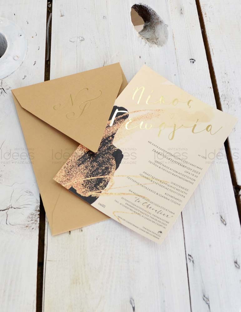 Μοντέρνο προσκλητήριο γάμου. Διαστάσεις: Κάρτα 14 Χ 19 εκ. σε Light Gold μεταλλικό χαρτί στα 250 γρ. Φάκελος 14,5 Χ 19,5 εκ. σε Sand μεταλλικό χαρτί στα 250 γρ. Εκτύπωση κάρτας δείγματος: Απλή, τετραχρωμία. Εκτύπωση φακέλου δείγματος: Απλή, τετραχρωμία.
