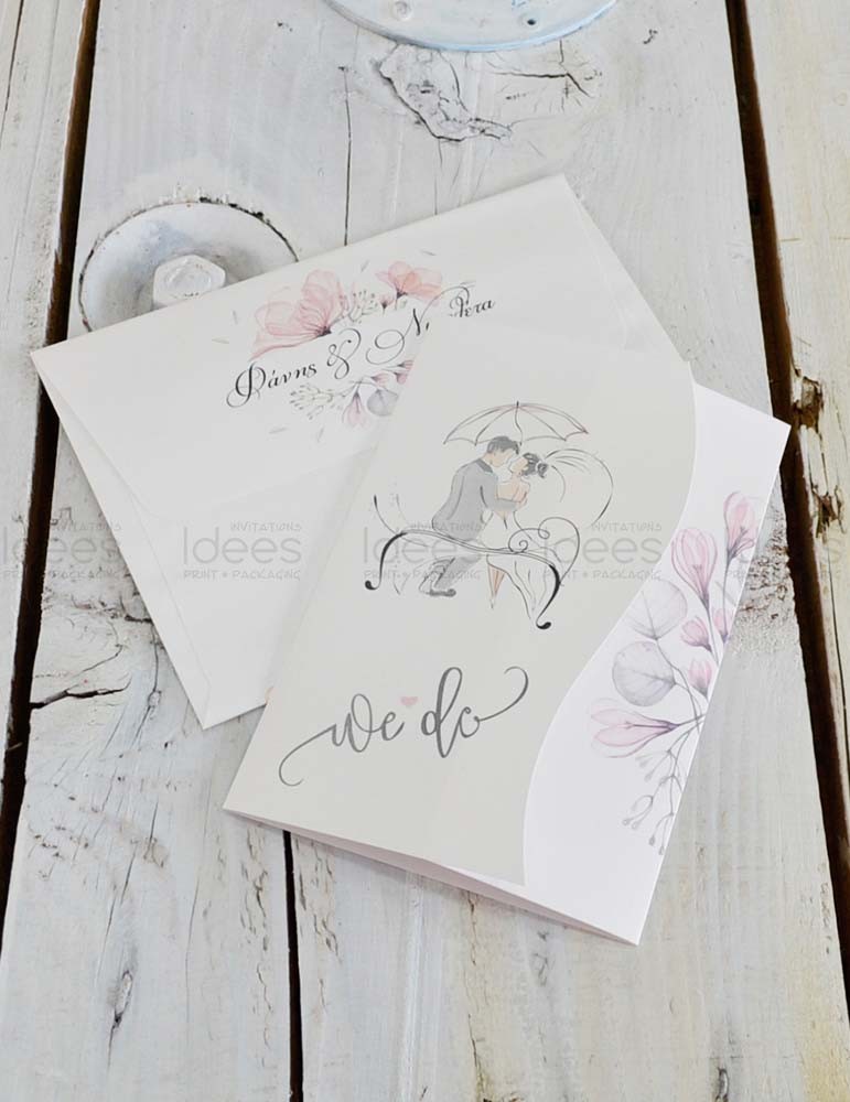 Μοντέρνο προσκλητήριο γάμου. Διαστάσεις: Κάρτα 17.5 Χ 17.5 εκ. Φάκελος 18 Χ 18 εκ. Εκτύπωση κάρτας δείγματος: Απλή, τετραχρωμία. Εκτύπωση φακέλου δείγματος: Θερμοτυπία Χρυσή (Χρυσοτυπία)