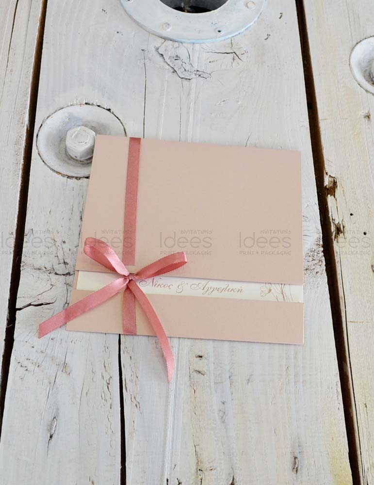 Κλασσικό προσκλητήριο γάμου. Διαστάσεις: Κάρτα 14 Χ 19 εκ. σε Light Gold μεταλλικό χαρτί στα 250 γρ. Φάκελος 14,5 Χ 19,5 εκ. σε Light Gold μεταλλικό χαρτί στα 250 γρ. Εκτύπωση κάρτας δείγματος: Απλή, τετραχρωμία. Εκτύπωση φακέλου δείγματος: θερμοτυπία ροζ χρυσό