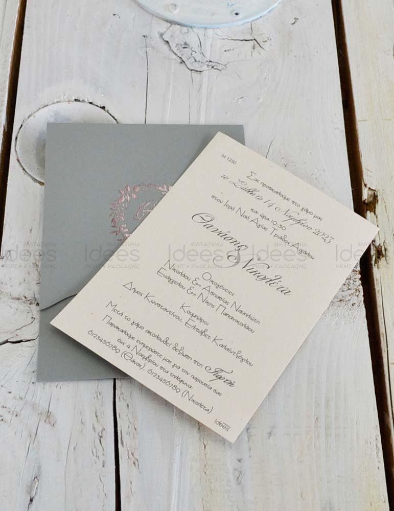 Χειροποίητο προσκλητήριο γάμου. Διαστάσεις: Πλάτη 19,5 Χ 19,5 εκ. σε Iron μεταλλικό χαρτί στα 250γρ. Κάρτα επίθετη 15 Χ 15 εκ. σε Marble White μεταλλικό χαρτί στα 250 γρ. και κολλημένη στην πλάτη. Φάκελος 20 Χ 20 εκ. σε λευκό ειδικό μεταλλικό χαρτί Linea στα 340 γρ. Εκτύπωση κάρτας δείγματος: Ανάγλυφη, χρώμα γκρι σκούρο (P9U). Εκτύπωση φακέλου δείγματος:...
