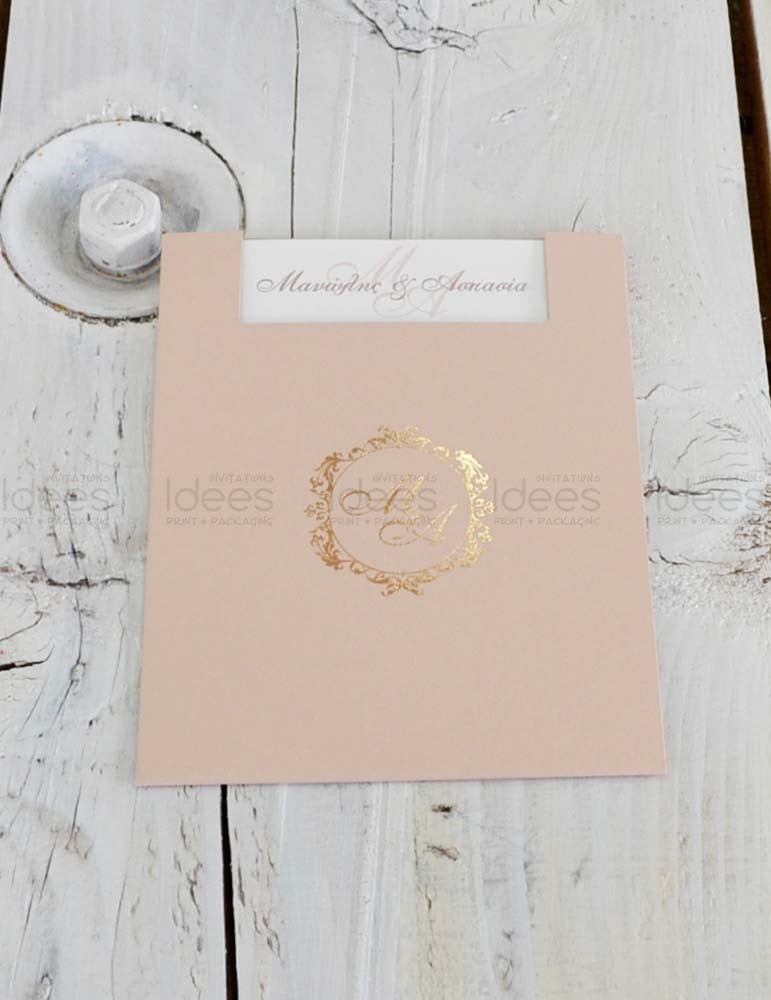 Μοντέρνο προσκλητήριο γάμου. Διαστάσεις: Κάρτα 14 Χ 19 εκ. σε Old Mill χαρτί στα 300 γρ. Φάκελος 15 Χ 20 εκ. σε Nude Metal χαρτί στα 120 γρ. Εκτύπωση κάρτας δείγματος: Απλή τετραχρωμία, με προτυπωμένη Ροζ-Χρυσό θερμοτυπία Εκτύπωση φακέλου δείγματος: Θερμοτυπία Ροζ-Χρυσό