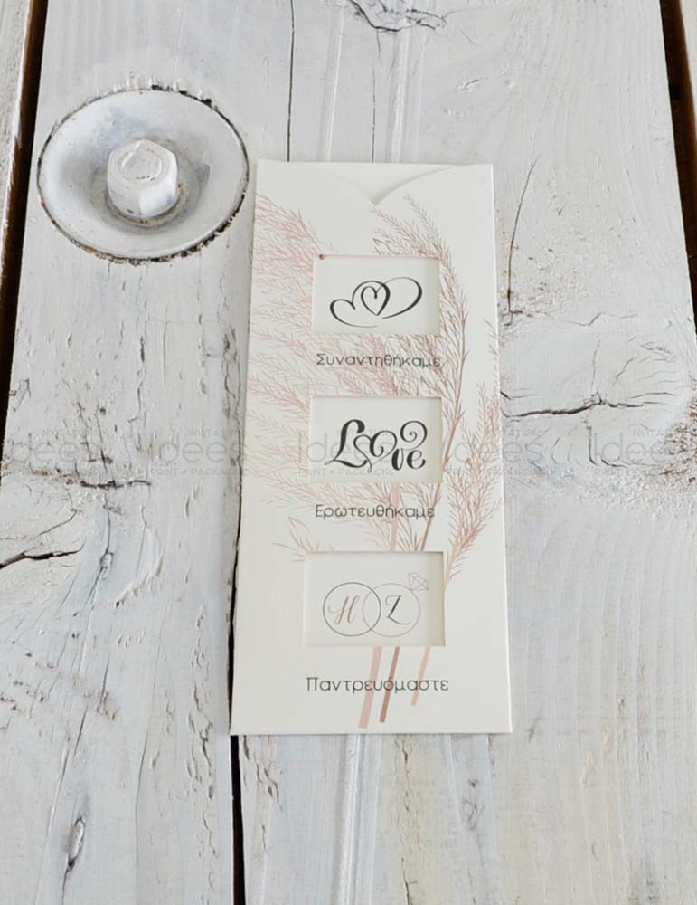 Προσκλητήριο γάμου και βάπτισης. Διαστάσεις: Κάρτα 14*19 εκ. σε Marble White μεταλλικό χαρτί στα 250 γρ. Φάκελος 15*20 εκ. σε Marble White μεταλλικό χαρτί στα 120 γρ. Εκτύπωση δείγματος απλή τετραχρωμία. Η τιμή του προσκλητηρίου αναφέρεται χωρίς εκτύπωση. Για να επιλέξετε το είδος της εκτύπωσης πατήστε ΕΔΩ