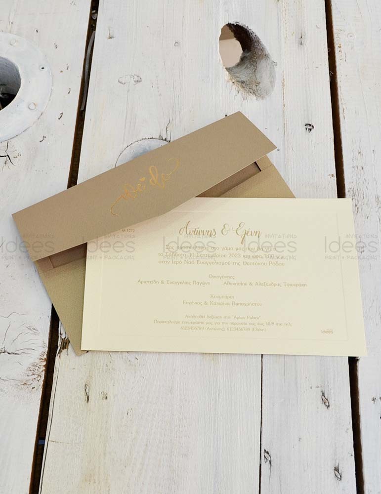 Προσκλητήριο γάμου με χρυσοτυπία στην κάρτα.