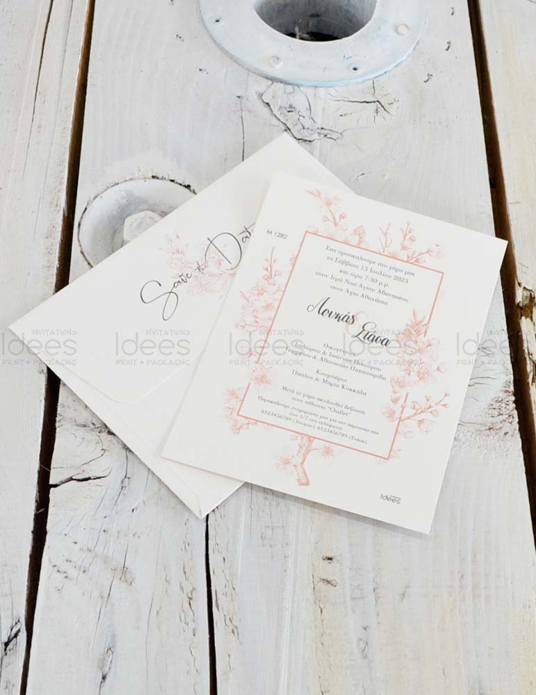 Μοντέρνο προσκλητήριο γάμου. Διαστάσεις: Κάρτα 14,2 Χ 19,5 εκ. σε Remake Oyster χαρτί στα 250 γρ. Φάκελος 13,8 Χ 19,3 εκ. σε Polvere χαρτί στα 215 γρ. Εκτύπωση κάρτας δείγματος: Απλή, τετραχρωμία. Εκτύπωση φακέλου δείγματος: Θερμοτυπία μολυβί.