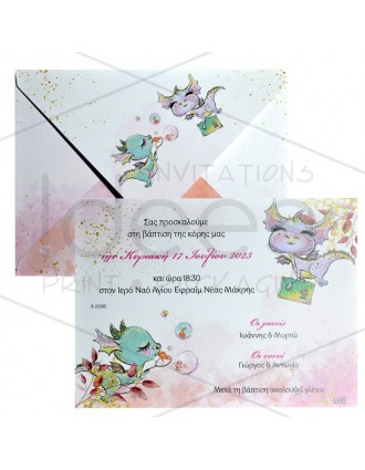 Προσκλητήριο βάπτισης. Κάρτα σε Corn 250 γραμμαρίων Φάκελος Pesca 215 γραμμαρίων Διαστάσεις: Κάρτα 15.8 Χ 18.7 εκ. Φάκελος 16 Χ 19 εκ.