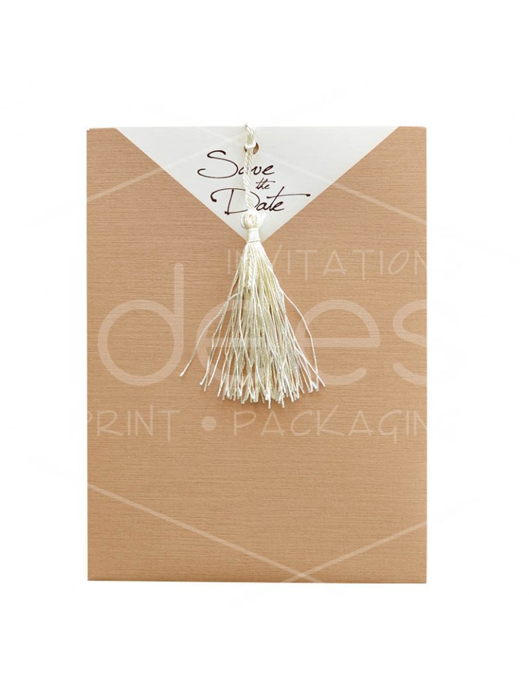 Προσκλητήριο γάμου κασετίνα με μύτη στον φάκελο και φούντα στην κάρτα.