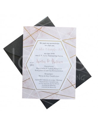Μοντέρνο προσκλητήριο γάμου. Διαστάσεις: Κάρτα 14 Χ 19 σε Λευκό μεταλιζέ χαρτί στα 250 γρ. Φάκελος 14,5 X 19,5 εκ. σε Λευκό μεταλιζέ χαρτί στα 250 γρ. Εκτύπωση κάρτας δείγματος: Απλή, τετραχρωμία. Εκτύπωση φακέλου δείγματος: Θερμοτυπία χρυσή (Χρυσοτυπία)