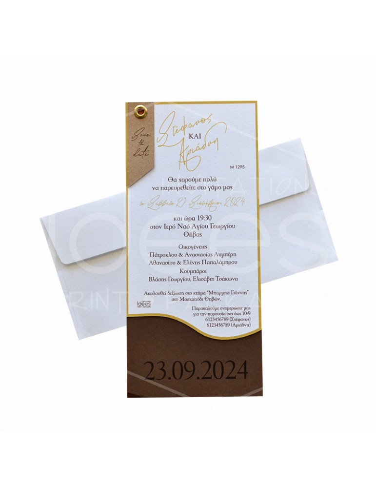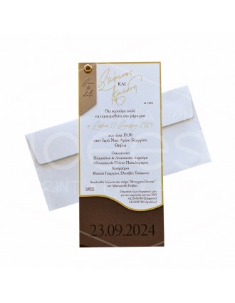 Μοντέρνο προσκλητήριο γάμου με τριπλή επιφάνεια χαρτιού και δεμένα με κλιπς.