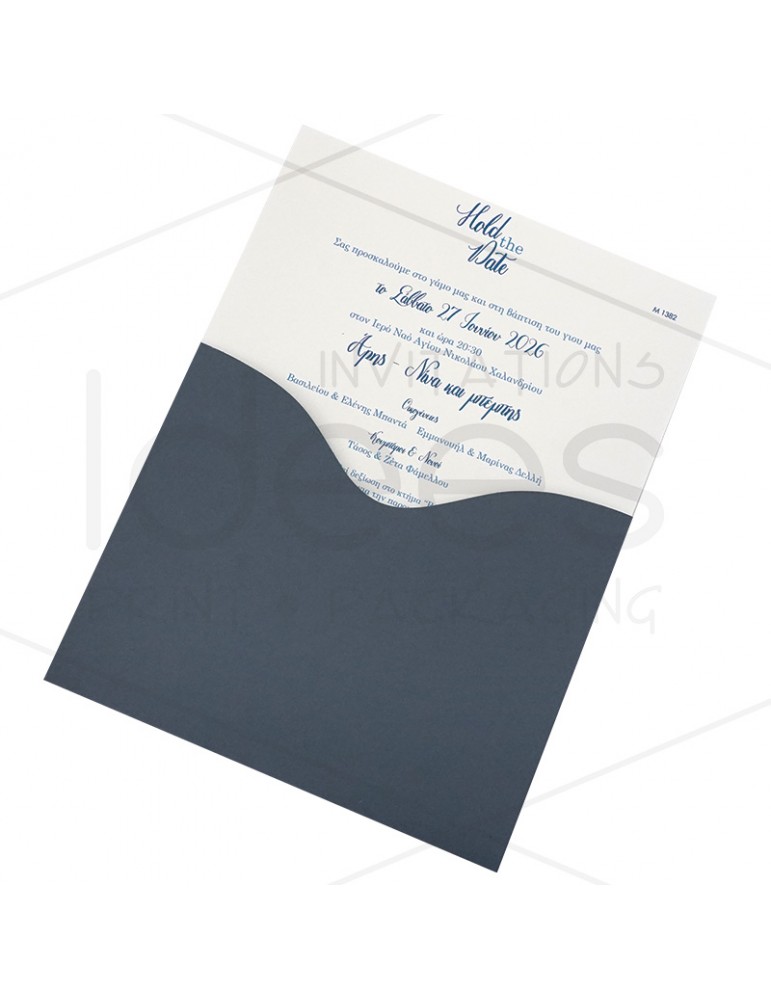 Προσκλητήριο γάμου και βάπτισης. Διαστάσεις: Κάρτα 14*19 εκ. σε Marble White μεταλλικό χαρτί στα 250 γρ. Φάκελος 15*20 εκ. σε Marble White μεταλλικό χαρτί στα 120 γρ. Εκτύπωση δείγματος απλή τετραχρωμία. Η τιμή του προσκλητηρίου αναφέρεται χωρίς εκτύπωση. Για να επιλέξετε το είδος της εκτύπωσης πατήστε ΕΔΩ