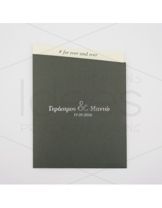 Μοντέρνο προσκλητήριο γάμου. Διαστάσεις: Κάρτα 16 Χ 16 εκ. σε Μέταλ Λευκό χαρτί στα 250 γρ. Φάκελος 16,7 Χ 16,7 εκ. σε Μέταλ Λευκό χαρτί στα 250 γρ. Εκτύπωση κάρτας δείγματος: Απλή τετραχρωμία Εκτύπωση φακέλου δείγματος: Απλή τετραχρωμία
