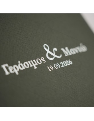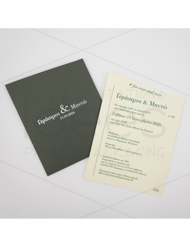 Μοντέρνο προσκλητήριο γάμου. Διαστάσεις: Κάρτα 11,5 Χ 16 εκ. σε Εκρού μεταλιζέ χαρτί στα 250 γρ. Ανάπτυγμα κάρτας 34 Χ 16 εκ. Φάκελος 13 Χ 17,5 εκ. σε Sand χαρτί στα 120 γρ. Εκτύπωση κάρτας δείγματος: Απλή, τετραχρωμία 2ης όψης.