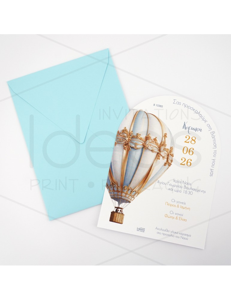 Προσκλητήριο βάπτισης αερόστατο με οβαλ κάρτα στο επάνω μέρος.
