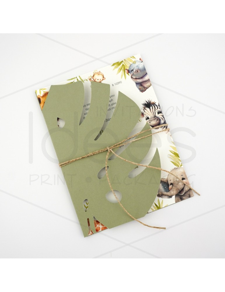 Προσκλητήριο βάπτισης ζωάκια του δάσους με φάκελο σε σχήμα φύλλου, το δένουμε με σπάγγο.