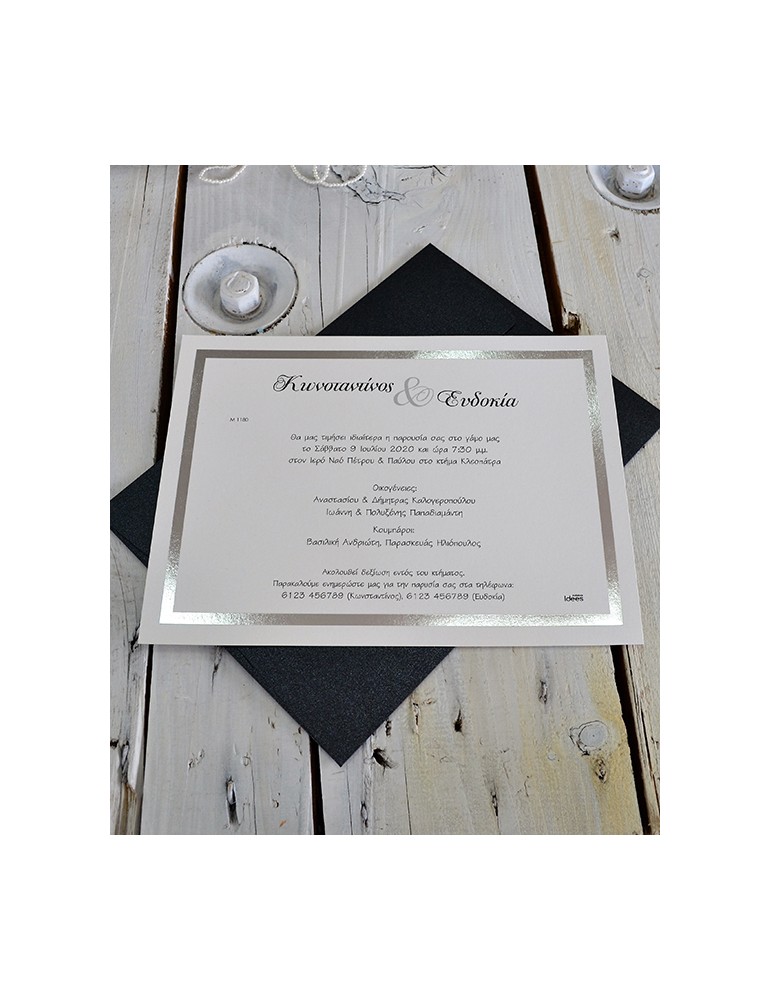 Μοντέρνο προσκλητήριο σε κλασική γραμμή. Κάρτα 14 Χ 19 σε χαρτί Milk μεταλιζέ στα 250 γρ. Φάκελος 14,5 Χ 19,5 σε χαρτί Lunar Nexus Platinum 240 γρ. Στην τιμή δεν συμπεριλαμβάνετε η εκτύπωση.