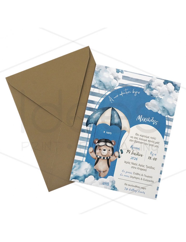 Προσκλητήριο βάπτισης με το αρκουδάκι μικρό αλεξιπτωτιστή.