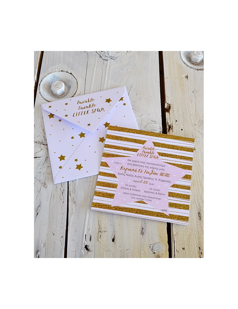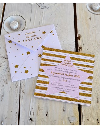 Προσκλητήριο βάπτισης. Kάρτα σε Λευκό Μεταλιζέ χαρτί στα 250 γρ. Φάκελος σε Nude Metal χαρτί στα 120 γρ. Διαστάσεις: Κάρτα 14 Χ 19 εκ. Φάκελος 15 Χ 20 εκ.