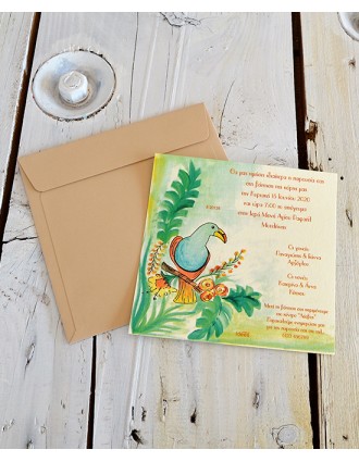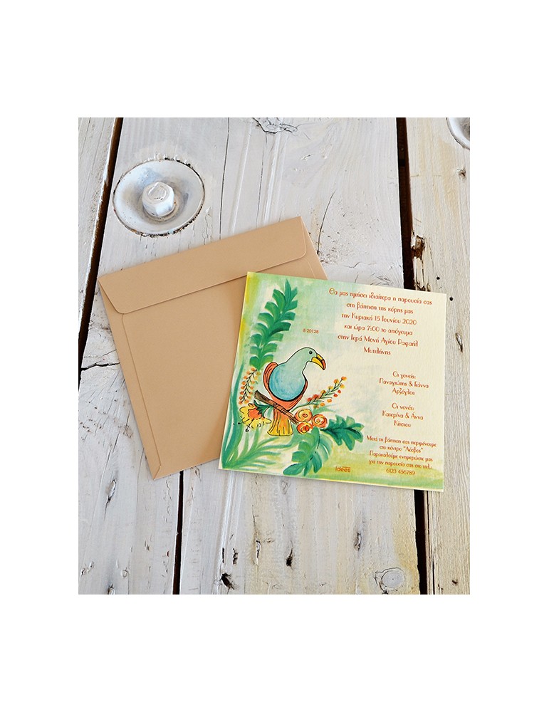 Πρόσκληση βάπτισης με παγώνι με λουλούδια. Κάρτα 14 Χ 19 εκ. με λοξό κόψιμο σε χαρτί Crush Corn 250 gr. Φάκελος 14,5 Χ 20 εκ. με λοξό κλείσιμο τυπωμένος εξωτερικά και εσωτερικά σε χαρτί Crush Corn 250 gr.