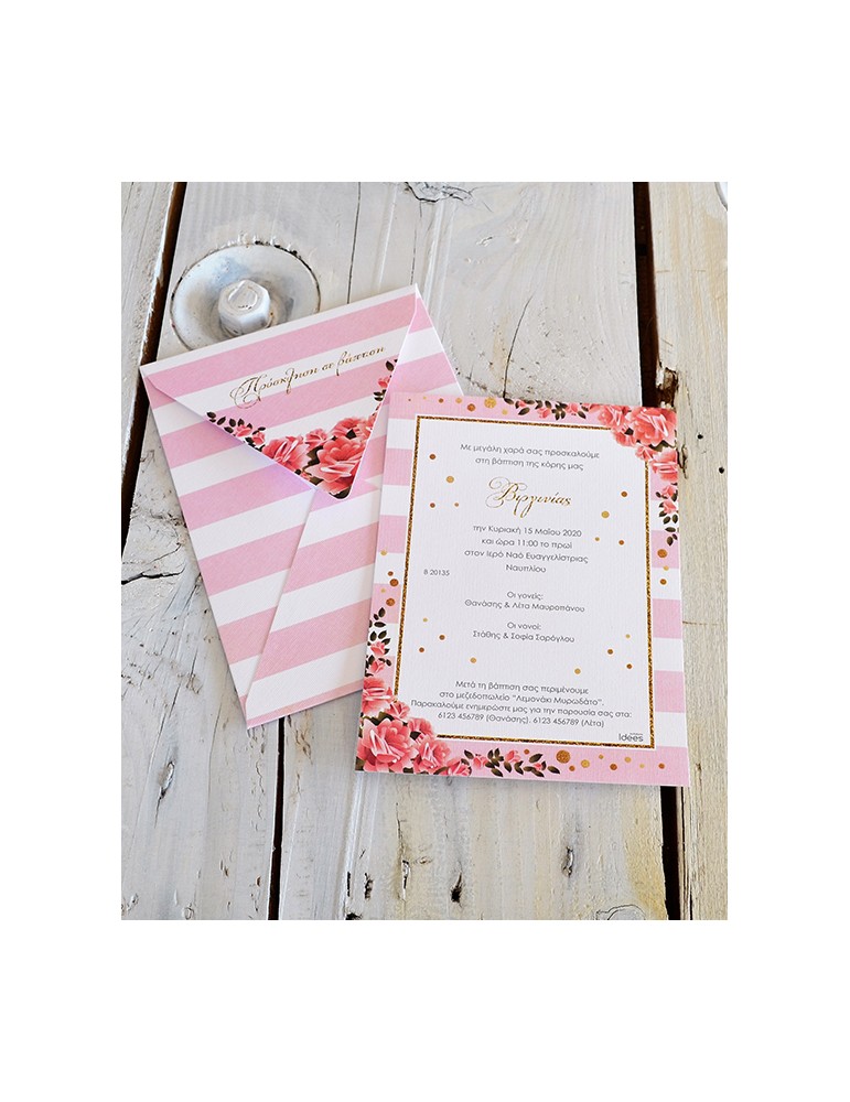 Προσκλητήριο βάπτισης. Kάρτα σε Bianco Flash Premium χαρτί στα 300 γρ. Φάκελος σε Bianco Flash Premium χαρτί στα 250 γρ. Διαστάσεις: Κάρτα 15 Χ 15,8 εκ. Φάκελος 15,3 Χ 16 εκ.