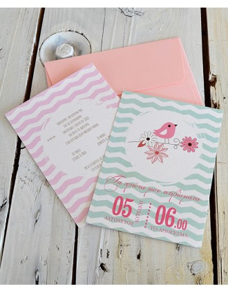 Προσκλητήριο βάπτισης. Kάρτα σε Οπαλίνα Naturale χαρτί στα 300 γρ. Φάκελος σε Burano Pink χαρτί στα 200 γρ. Διαστάσεις: Κάρτα 14 Χ 19 εκ. Φάκελος 15 Χ 20 εκ.