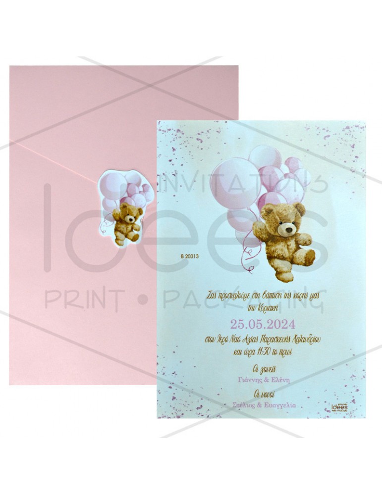 Προσκλητήριο βάπτισης. Kάρτα σε Bianco Flash Premium χαρτί στα 300 γρ. Φάκελος σε Burano Pink χαρτί στα 200 γρ. Διαστάσεις: Κάρτα 14 Χ 19 εκ. Φάκελος 14.5 Χ 19.5 εκ.