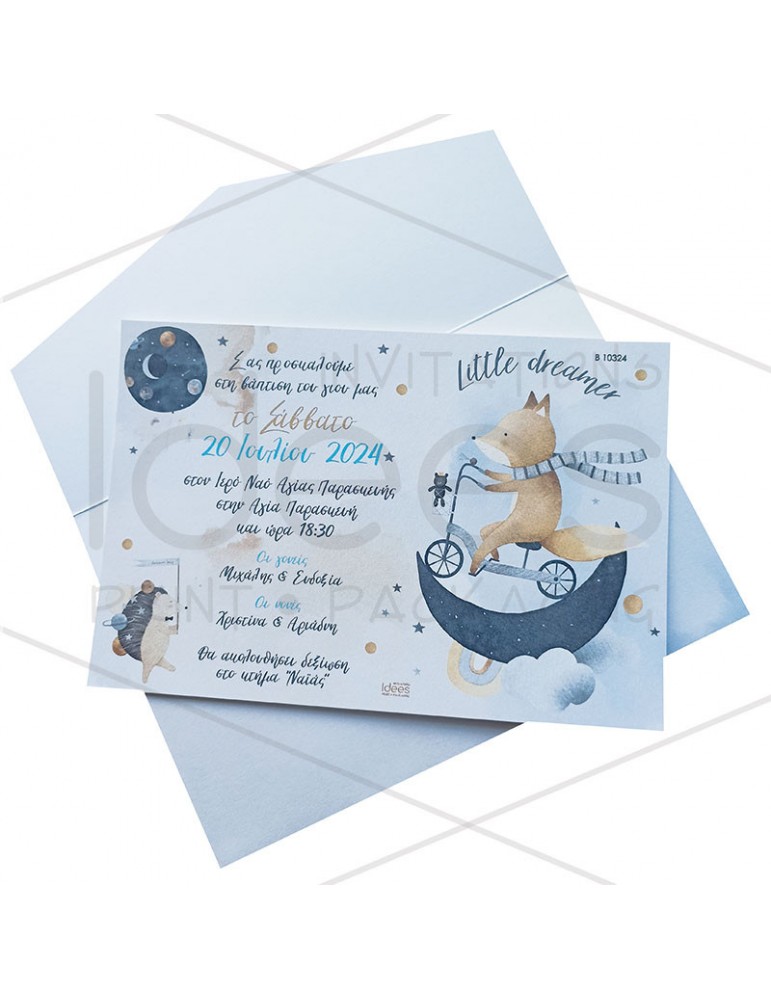 Προσκλητήριο βάπτισης little boy. Κάρτα 2 όψεων 16 Χ 16 σε χαρτί Old Mill Premium 250gr Φάκελος 16,7 Χ 16,7 τυπωμένος εξωτερικά σε χαρτί Old Mill Premium 250gr