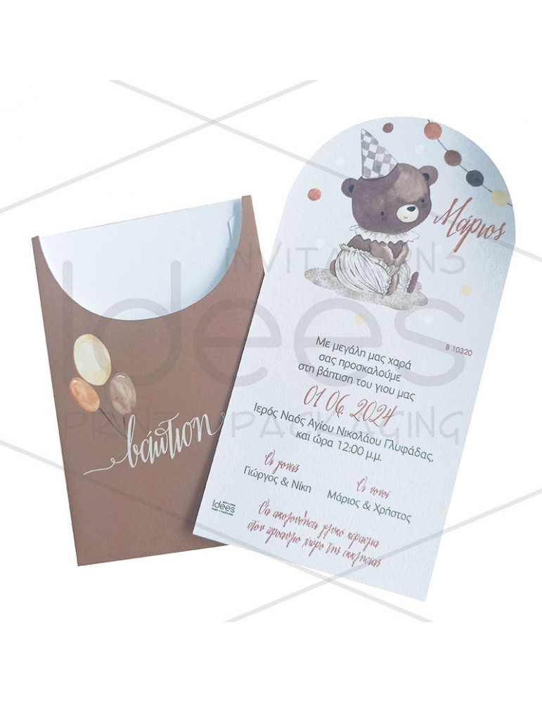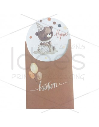 Προσκλητήριο βάπτισης ζωάκια του δάσους. Κάρτα 14 Χ 19 εκ. σε χαρτί Old Mill Premium στα 300 γρ. Φάκελος 15 Χ 20 σε χαρτί Old Mill Premium στα 250 γρ. εκτυπωμένος εξωτερικά.