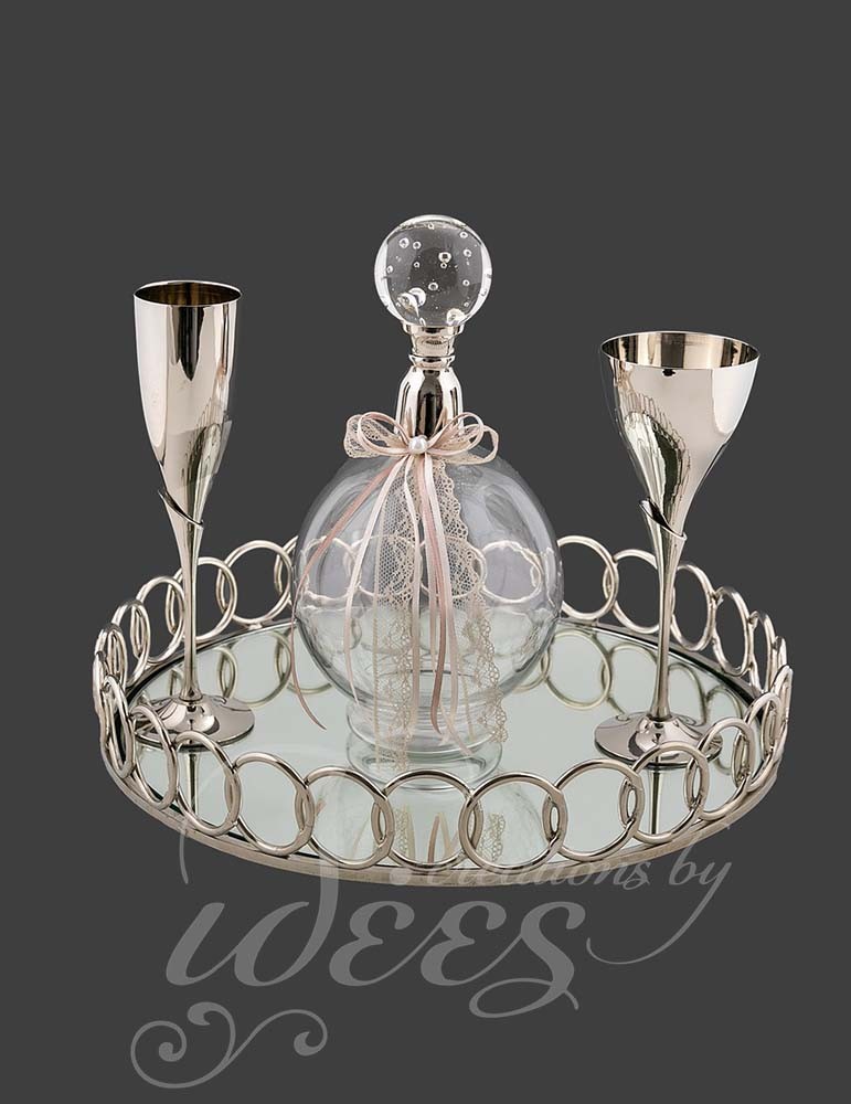 Σετ κουμπάρου. Περιλαμβάνει μοντέρνο δίσκο επάργυρο με καθρέπτη, κανάτα με ασημί τελειώματα και στρας στο λαιμό, ποτήρι κρασιού με ασημί τελειώματα και στρας στο ποδαράκι και την ίδια λογική στα ποτήρια σαμπάνιας.